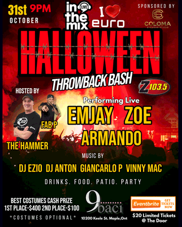 Halloween Throwback Bash at 9baci on October 31, 2025. Performing live: Emjay, Armando & Zoe.